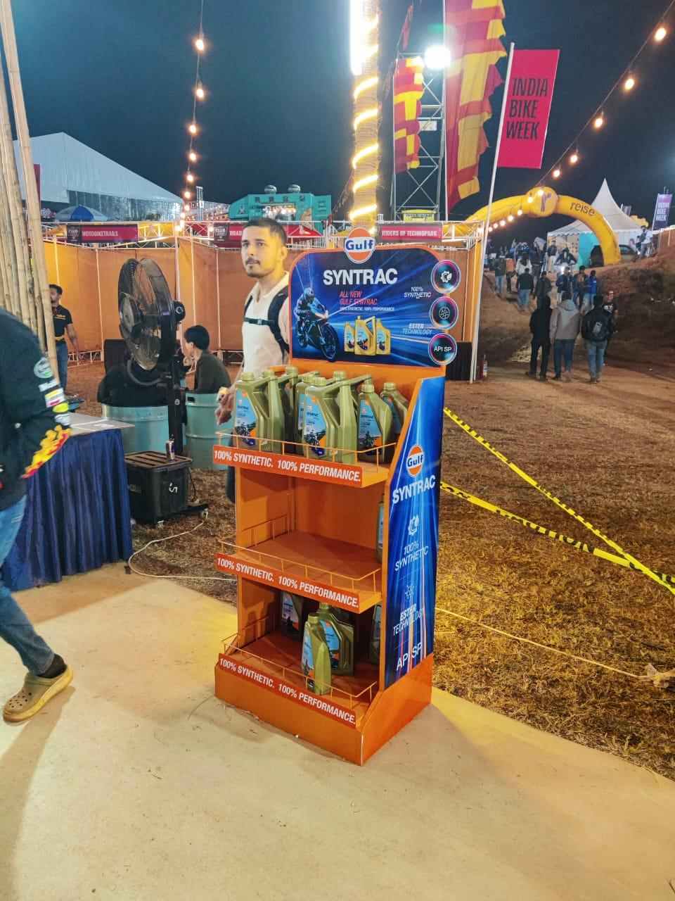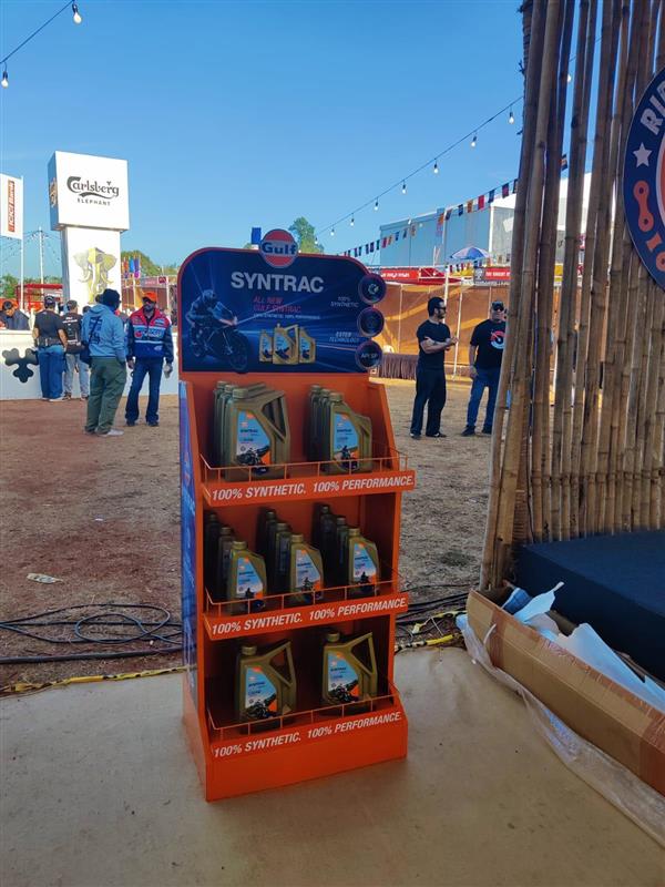 Multiplier supported the brand by conceptualizing and fabricating custom Floor Standing Units (FSUs) that showcased the newly launched Gulf Syntrac Engine Oil at the event. These retail-ready display units were designed to ensure strong product visibility, organized presentation, and seamless interaction in a high-footfall experiential environment. The FSUs played a crucial role in driving awareness, educating bikers, and facilitating meaningful conversations around product performance and application.